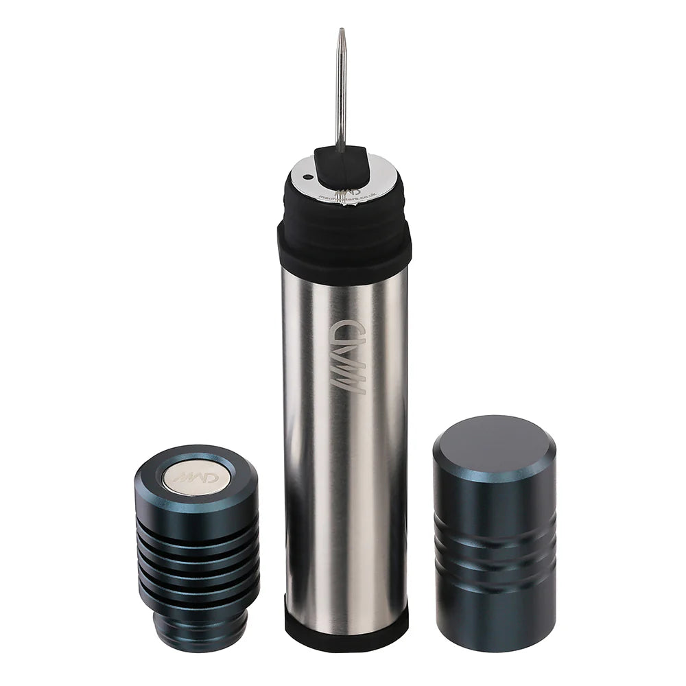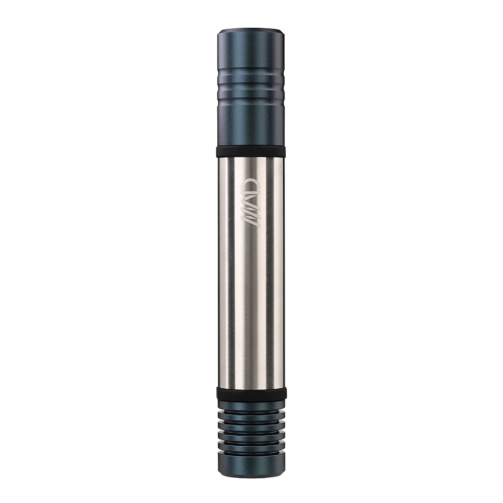 Silicone-lined stainless steel case with an aluminum cap and aluminum herb storage.