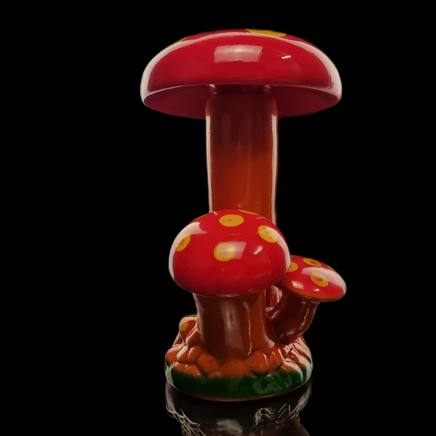 Ceramic Magic Mushie waterpipe by Agung.  Features a metal downstem with a brass bowl as well as a mushroom cap lid to place over the mouthpiece when not in use.  It looks like an ornamental sculpture when the lids on and hits like a mushie should with the cap off.
