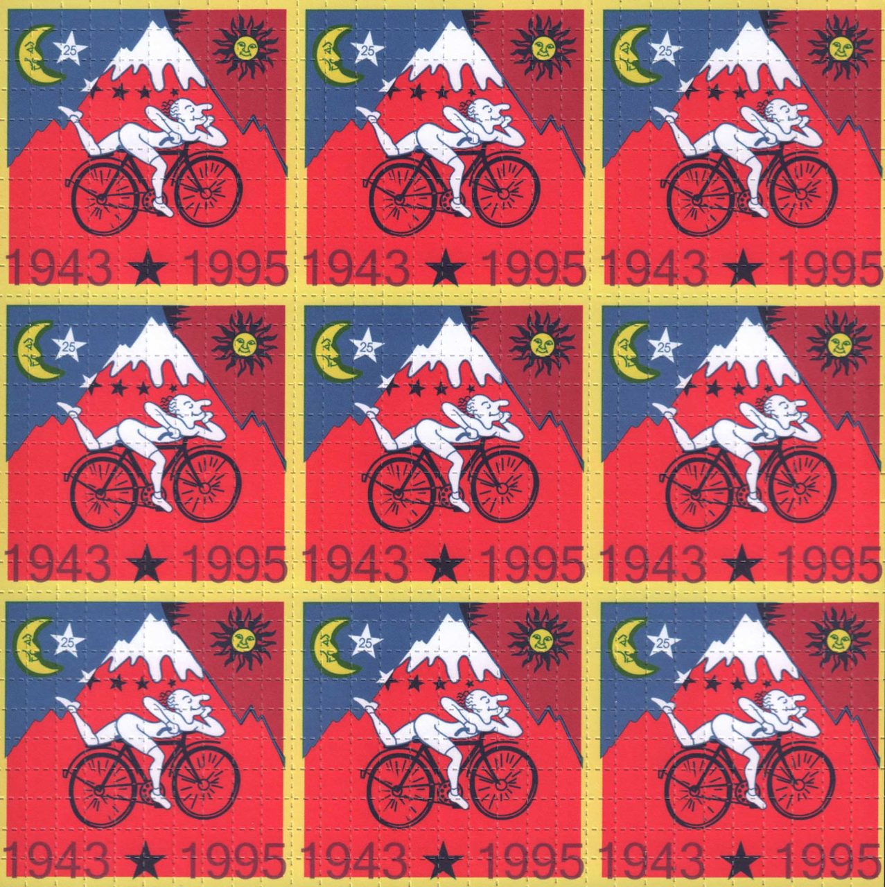Albert Hofmann Bike Ride 1943 Red 9 panel version of the classic bike ride design. 19.05cm square and perforated into 900 X 0.635cm squares. Professionally framed to preserve the art work. Sheets have never been dipped and are completely free of LSD.