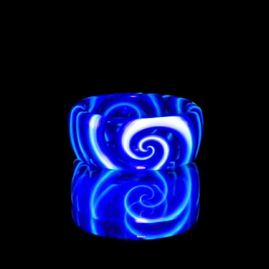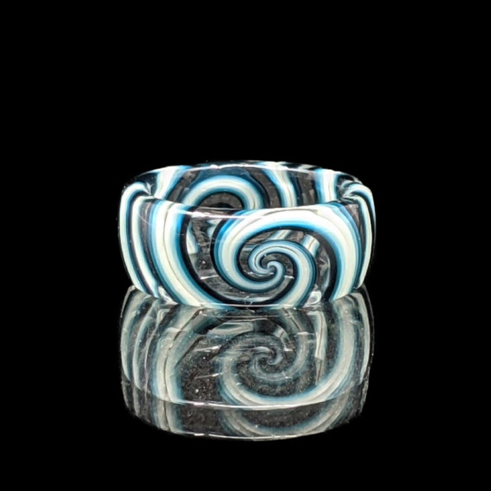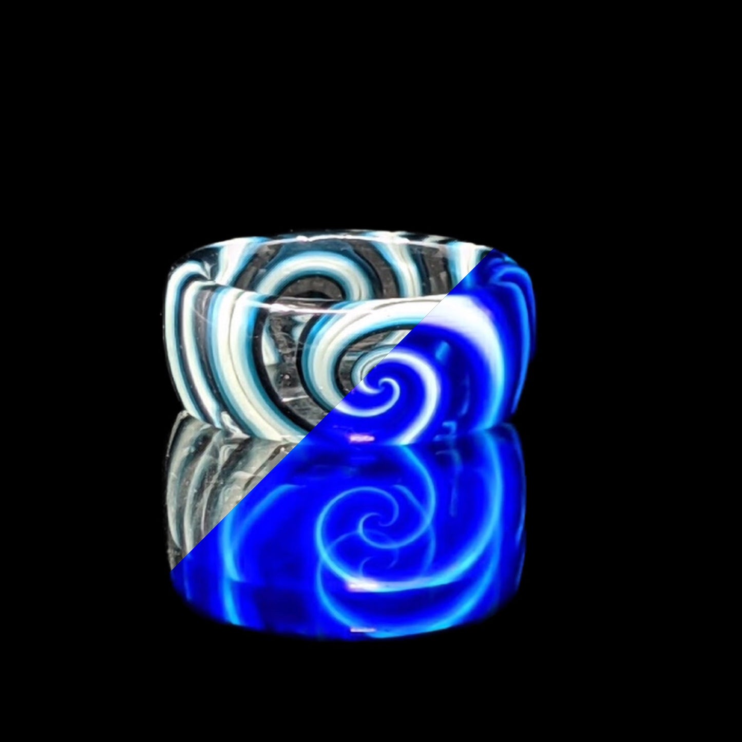 Glass UV reactive ring with white, blue & black linework by Pho Sco USA. Size 4. 14.9mm inner diameter.