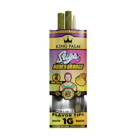 Open the cage, and step into the ring. The King Palm Suga Punch flavor is a potent combination of juicy oranges drizzled with pure honey. Experience a unique flavor fusion that delivers a knockout punch.  Each roll fits up to 1g of material and features a biodegradable corn husk filter tip.