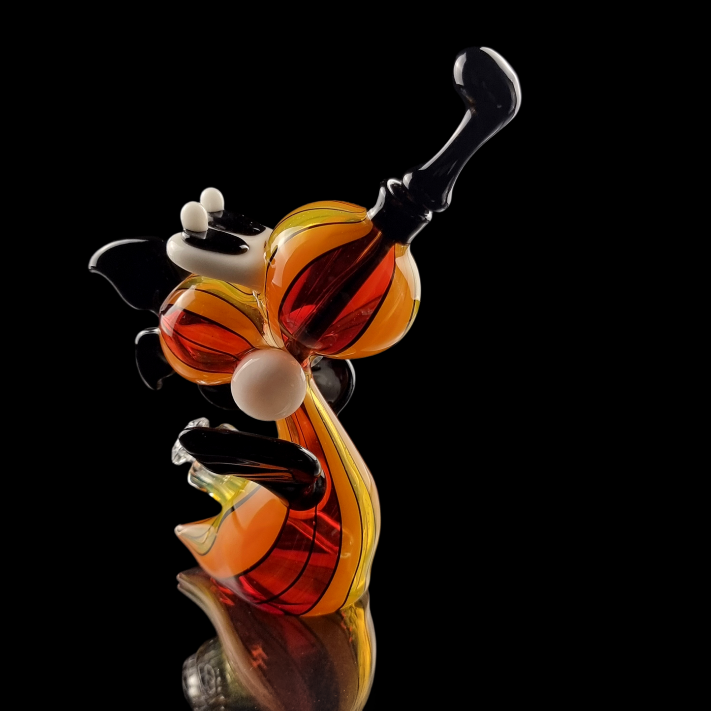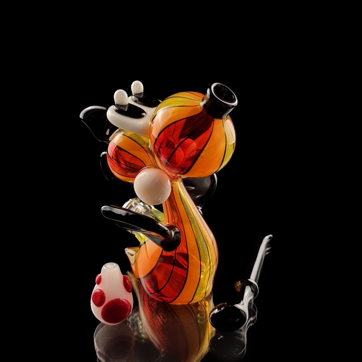 Step into a world of vibrant artistry with the latest creation from acclaimed glass artist Mike Lee, famously known as Lee Machine. This stunning glass piece features a mesmerizing blend of red, orange, and yellow pinstripes, reminiscent of flickering flames, meticulously sculpted to embody the playful spirit of Yoshi from Mario World and Mario Kart.