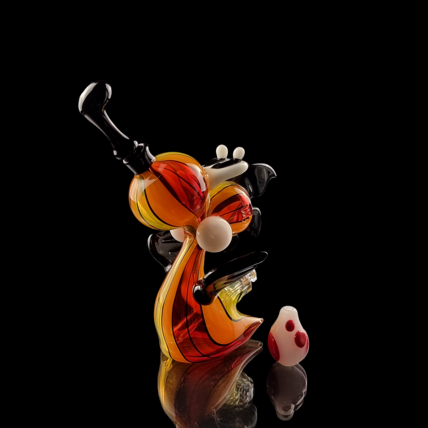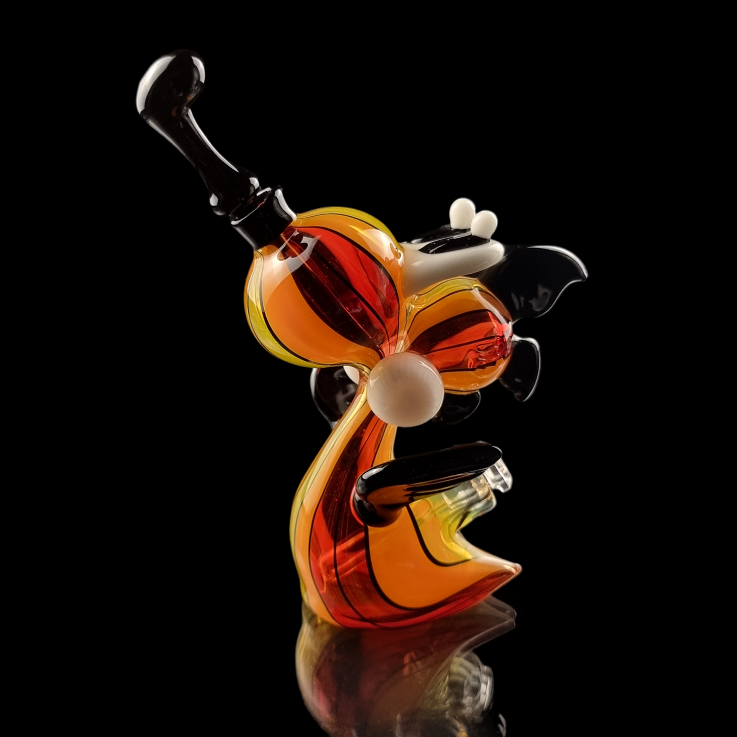 The piece showcases striking black wings and features an innovative black removable tongue that doubles as a dabber, making it a perfect blend of functionality and visual artistry. Crafted for enthusiasts who appreciate the intersection of pop culture, cannabis culture, and high-quality glass art, this piece is a must-have for any serious collector. The fiery pinstriped glass and the nostalgic nod to the Mario franchise make it a standout addition to any collection.