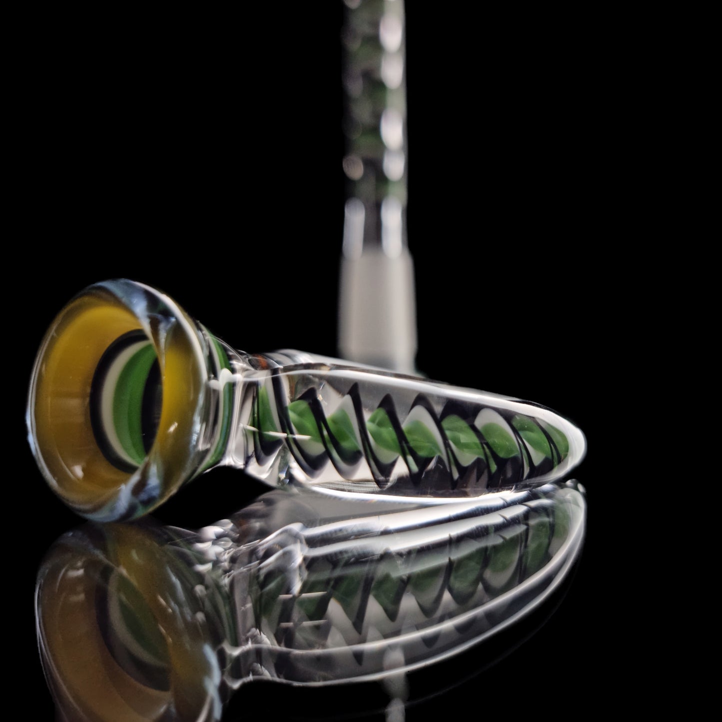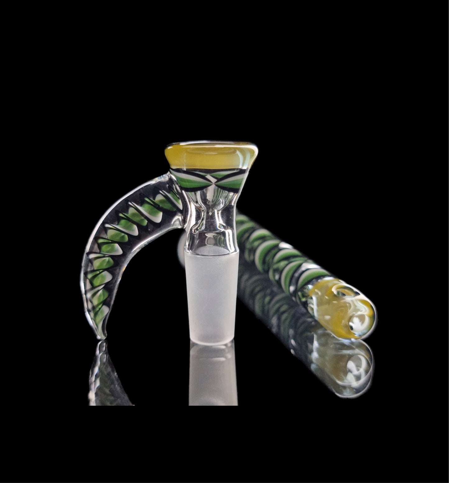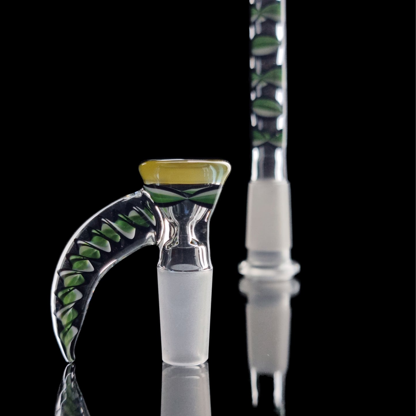 Multi section gridded 18mm to 14mm stem and matching martini style bowl with twisted cane horn.  Stem measures 15.3cm from the top of the grind to the bottom of the stem.