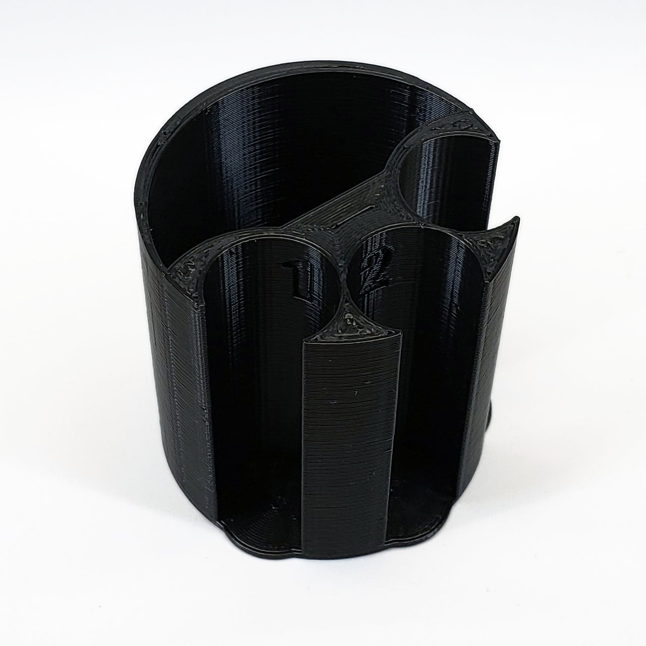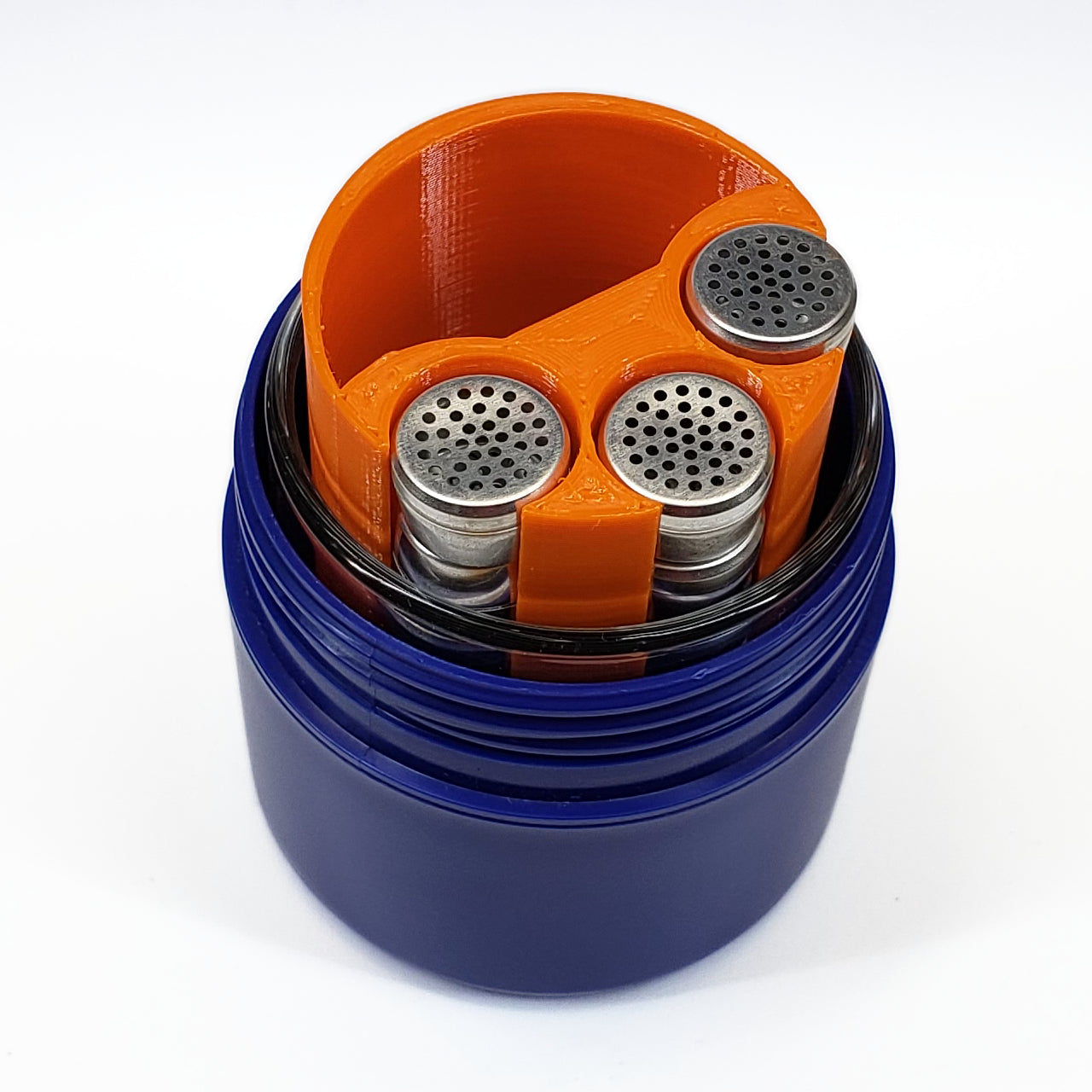 This small capsule caddy is specifically designed for the Storz & Bickel Dosing Capsules & the JyArz Satchmo glass lined containers. The caddy is made to hold five capsules in three rows (for a total of 15 capsules). The remaining space is open to store material, AVB, tools, spare capsules, etc.