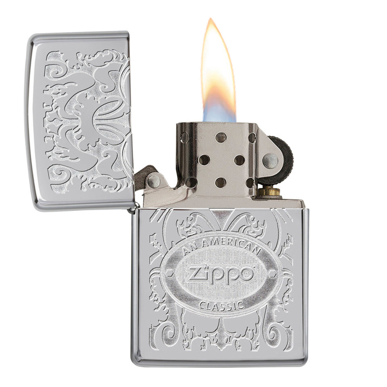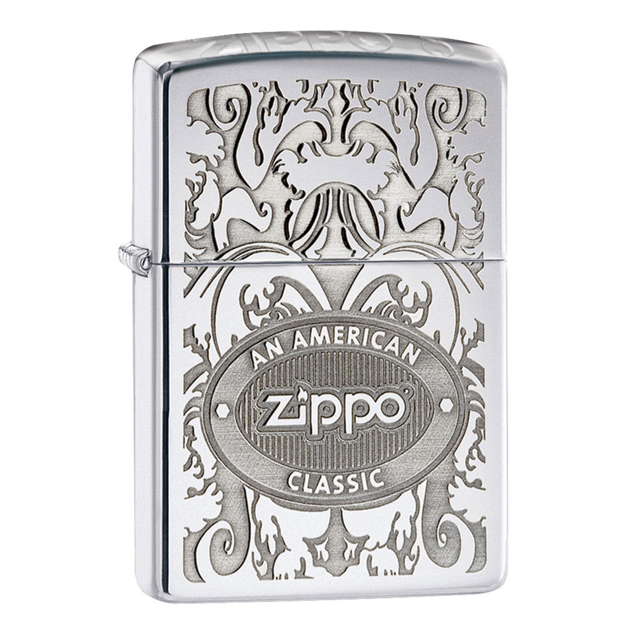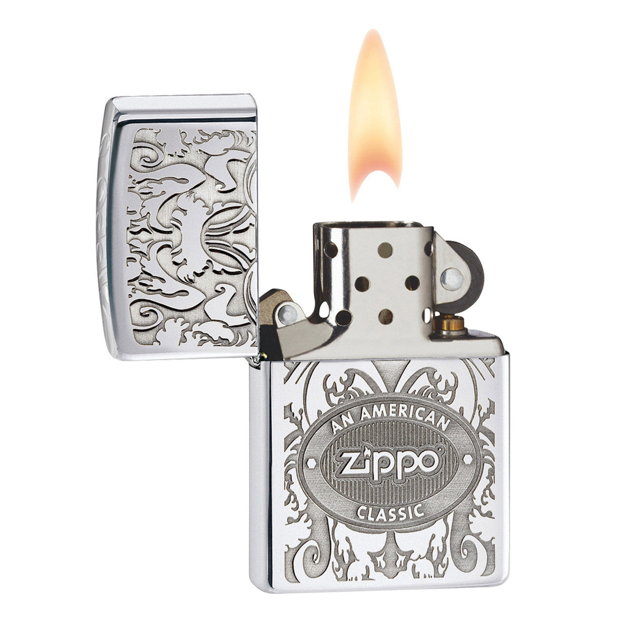 This elegant filigree lighter features the Zippo logo stamped on the top of the lid. This design uses the double lustre imprint method on a High Polish Chrome lighter. Comes packaged in a gift box. For optimal performance, fill with Zippo lighter fluid.