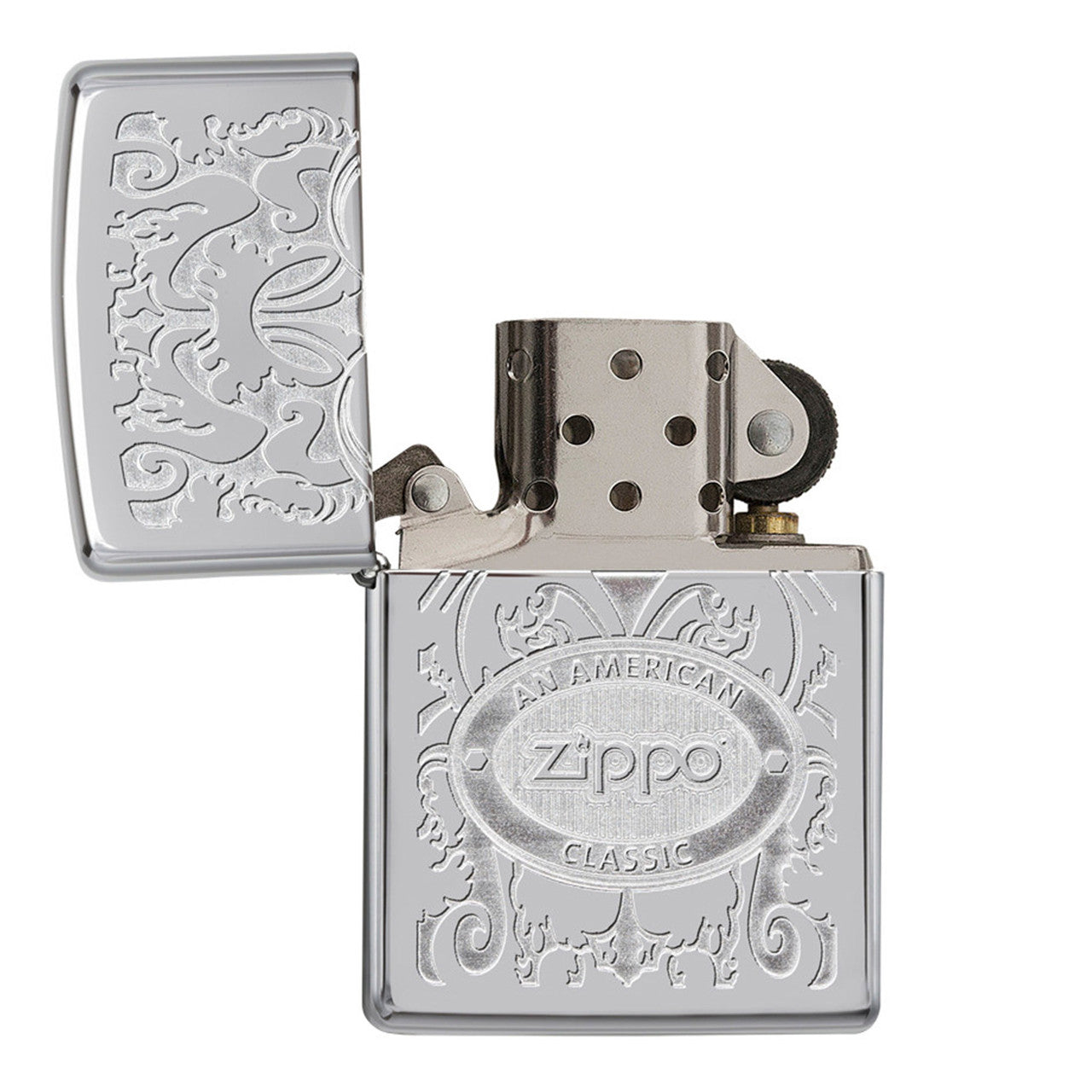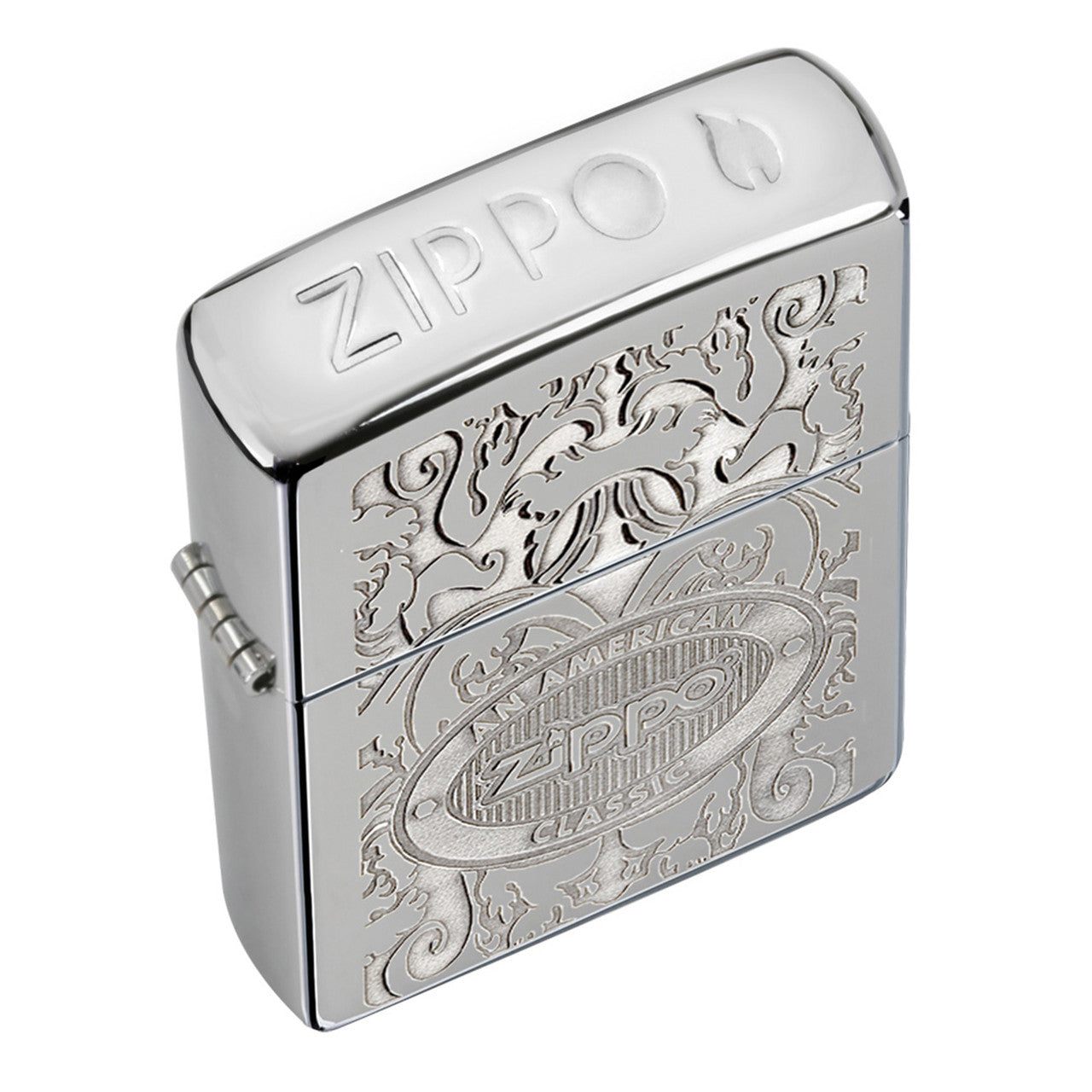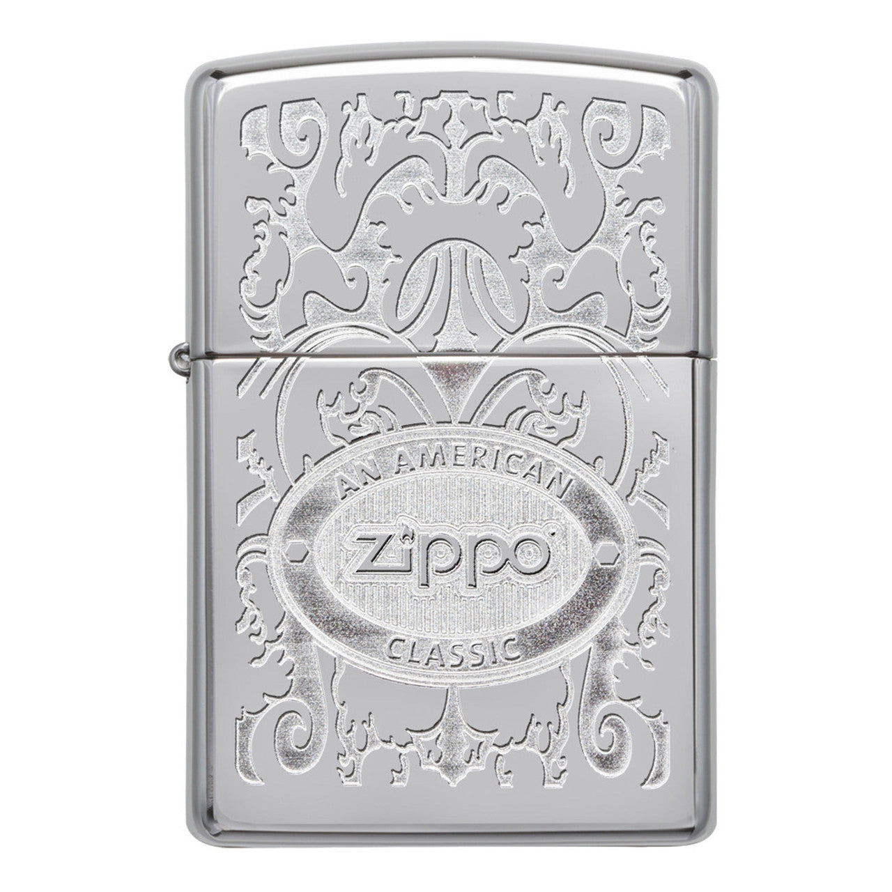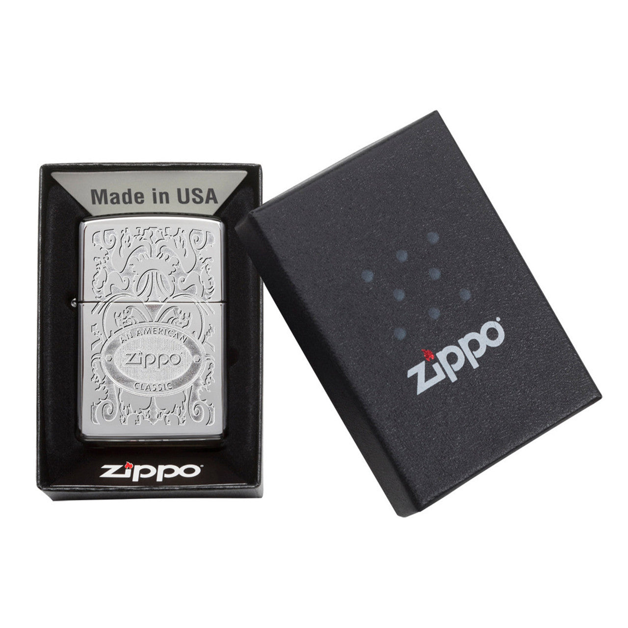 This elegant filigree lighter features the Zippo logo stamped on the top of the lid. This design uses the double lustre imprint method on a High Polish Chrome lighter. Comes packaged in a gift box. For optimal performance, fill with Zippo lighter fluid.